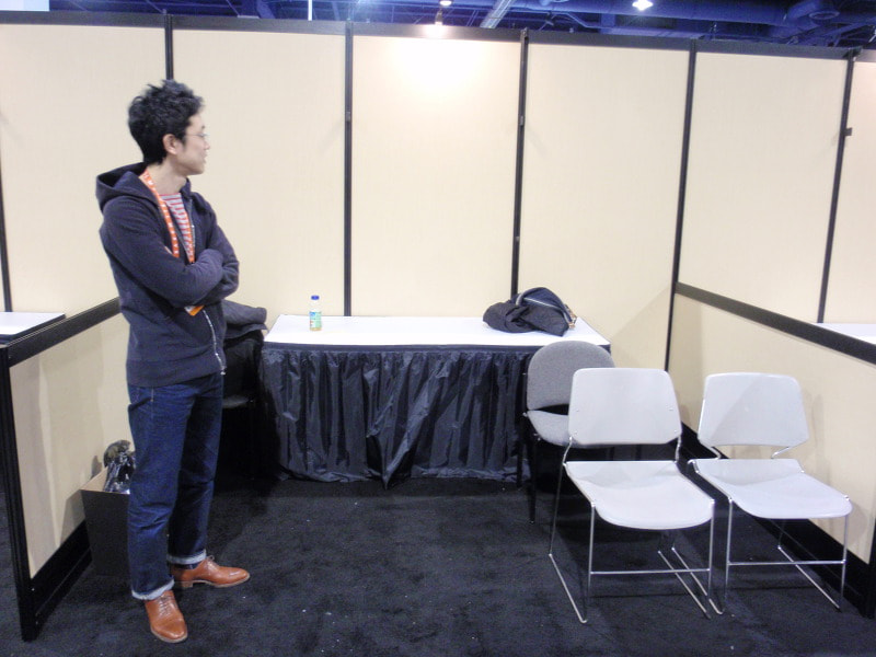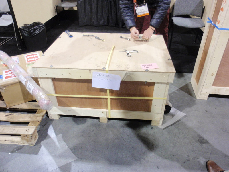 早速、会場の The Las Vegas Convention Center(LVCC)で、ブースの設備確認と荷受けを行いました。「非該当証明」うんぬん...そんな聞いたこともない言葉に翻弄され、慣れない輸出手続きに非常に手こずった荷物もちゃんと会場に届いておりました。ホッと一安心です。