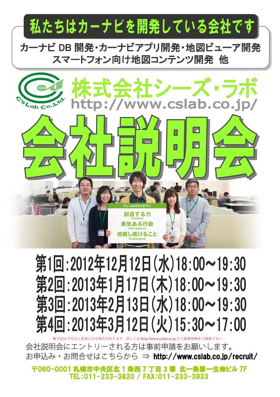 シーズ・ラボでは 2013年1月17日(木) 18:00から、札幌本社にて会社説明会を行います。