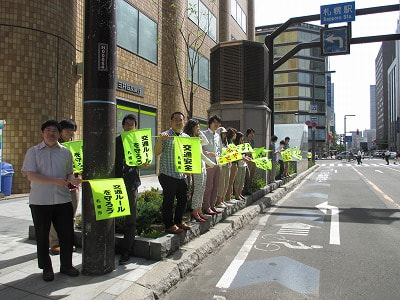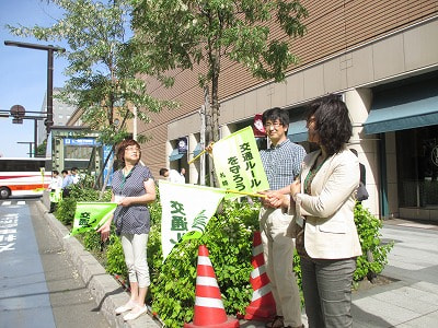 まず、中央警察署付近で、交通安全啓発「旗の波」(交通安全手旗等を掲げる交通安全啓発)に参加しました。![]()