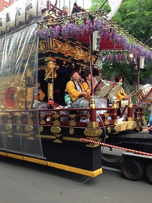 札幌市街地にある中島公園には夜店立ち並び大変にぎやかなのですが、開催期間中ずっと雨模様だったので少し残念でした。しかし!最終日、シーズ・ラボのすぐ近く大通公園を通る神輿や山車が練り歩く神輿渡御は辛うじて雨を免れました。![]()