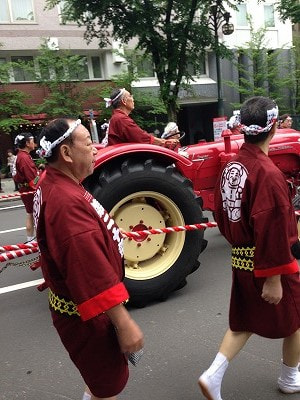 その昔、札幌市内を隅から隅まで神輿渡御していたそうですが、あまりにも日数がかかり過ぎ、1度だけトラクターを使って時速15キロで神輿渡御をしたことがあるそうです。あまりの早さに沿道の人たちは呆気にとられ、大変不評だったとのこと。翌年には元の神輿渡御に戻ったそうです。トラクターが山車を引いているのはその名残なのでしょうか?でも、現在は15キロよりかなりゆっくりな速度で走っていましたよ。