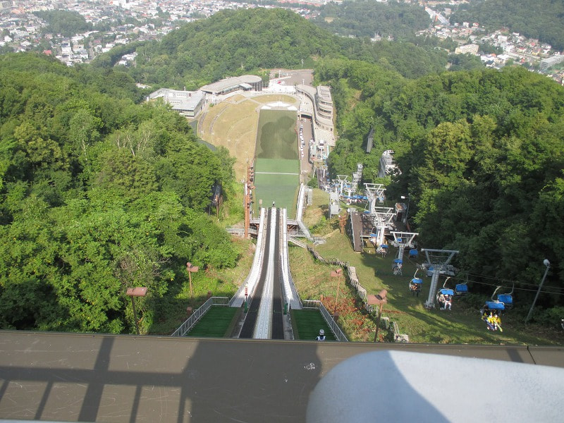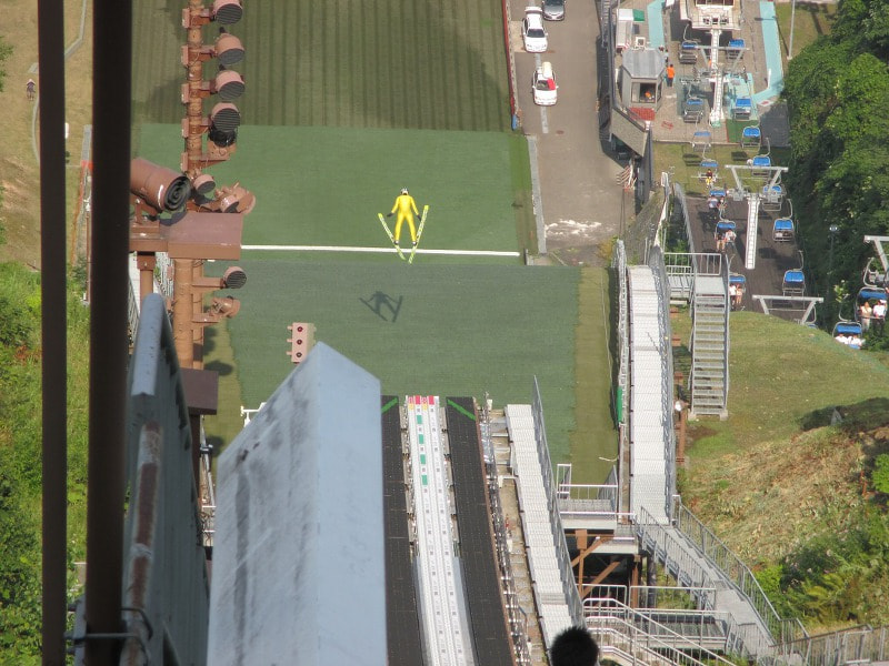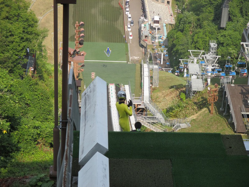 展望ラウンジから見るジャンプ場、かなりの高さと急斜面です。ここをスキーで滑り下りる、とか...考えるだけでも足がすくみます。選手の凄さを思い知らされます。