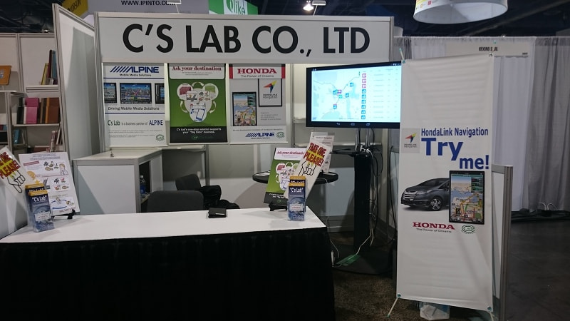 周りには有名な会社のブースが結構あるようですが、なぜかシーズ・ラボのお隣のブースは「カバン屋さん」らしいです(笑)。同じくナビ関連の会社がブース近くに出展していればいい刺激になりますね。