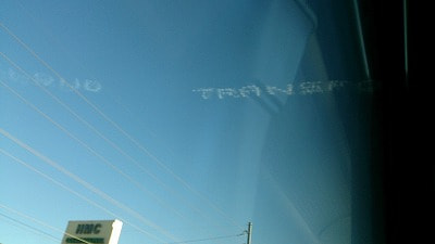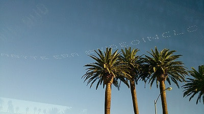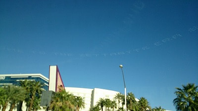 昨日と同じくシャトルバスで移動していると、空に文字が・・。