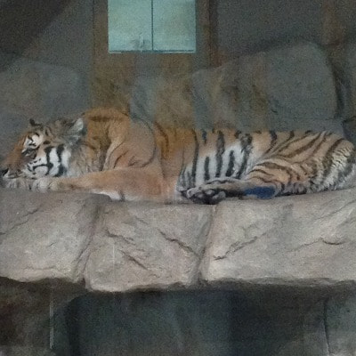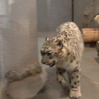 まず、待っていたのは寒帯館のアムールトラとユキヒョウです。アムールトラのタツオ君は、この日具合が悪いらしく室内で寝ていましたが、ユキヒョウは元気に動き回っていました。![]()