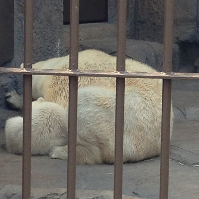 さて、札幌市円山動物園の話題といえば!昨年の12月に産まれた白クマの赤ちゃんです。この日も白クマのゲージの前には黒山の人だかり・・・。しかし残念なことに白クマの赤ちゃんは疲れて室内でママのララとお昼寝していました。![]()