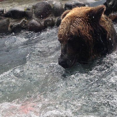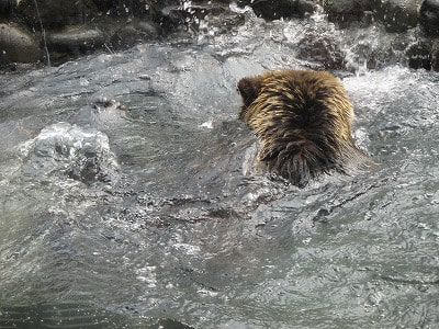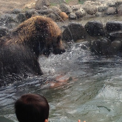 ヒグマの豪快なダイビングをすぐ目の前でみることができます。地元のせいなのか(?)ノリノリでプール遊びをしていました。