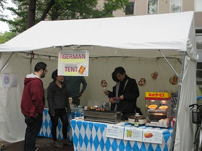 たくさんの模擬店の中、選んだのはこのソーセージ。昔のススキノの呼び込み並みのパワーに負けました(笑)。ベルギー(だったかな?)のソーセージで、日本では3社しか扱ってないレアもののソーセージだそう。とても美味しかったですよ~。暑かったら間違いなくビールが欲しくなる味でした。