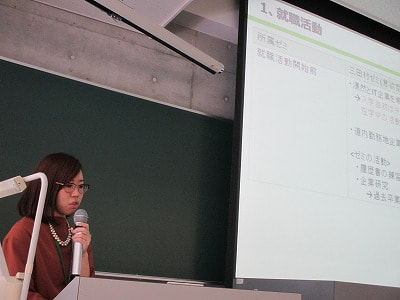 今回参加頂いた学生さんの先輩である北海道科学大学出身弊社社員からも、就職活動時のこと、シーズ・ラボに入社を決めた経緯、入社してからの業務などをお話しさせて頂きました。