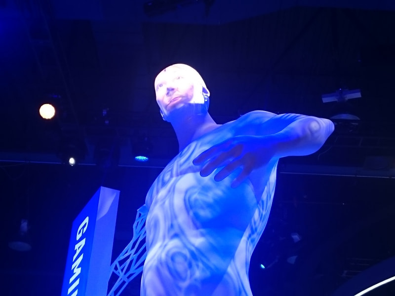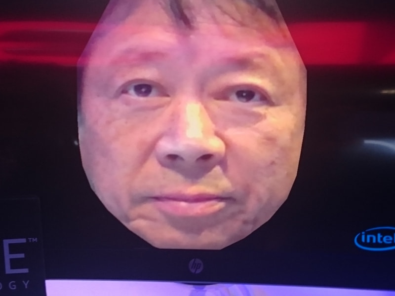 インテルブースで自分の顔を撮影してプロジェクトマッピングできる体験があるのですが、なんと、弊社社長の山田の顔が!!!