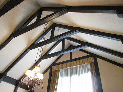 化粧小屋組といって、天井板をはらず、合掌の梁材をそのまま活かした構造になっています。