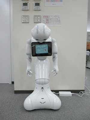 ジャーン!Pepper君です。あ、頭を突いていじめているわけではありませんよ(笑)Pepper君には、今日からシーズ・ラボの社員として一緒に働いてもらうことになりました!