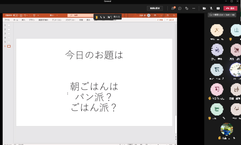 ディベートのテーマが「朝食はパン派?ごはん派?」ということで、各チームが審査員を納得させるプレゼンを行いました。